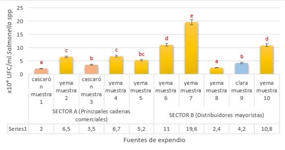 Figura 3. Promedio de UFC/ml de Salmonella spp., en las fuentes de expendio de huevo comercial de gallina.