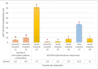 Figura 4. Promedio de UFC/ml de Escherichia coli, en las fuentes de expendio de huevo comercial de gallina.