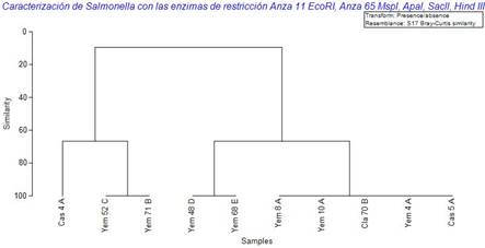 Figura 5. Agrupamiento de similitud de Bray-Curtis de 10 muestras de Salmonella spp., caracterizadas con la enzima de restricción Anza 11 EcoRI, Anza 65 Mspl, Apal, Sacll, Hind III; por Software Primer 7.