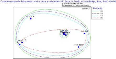 Figura 6. Agrupamiento de similitud MDS no métrico de 10 muestras de Salmonella spp., caracterizadas con la enzima de restricción Anza 11 EcoRI, Anza 65 Mspl, Apal, Sacll, Hind III; por Software Primer 7.