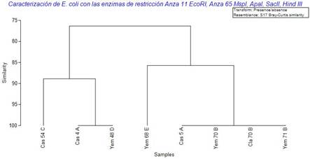 Figura 7. Agrupamiento de similitud de Bray-Curtis de 8 muestras de Escherichia coli caracterizadas con la enzima de restricción Anza 11 EcoRI, Anza 65 Mspl, Apal, Sacll, Hind III; por Software Primer 7.