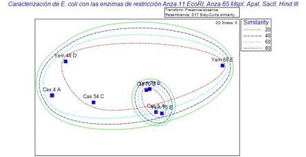 Figura 8. Agrupamiento de similitud MDS no métrico de 8 muestras de Escherichia coli caracterizadas con la enzima de restricción Anza 11 EcoRI, Anza 65 Mspl, Apal, Sacll, Hind III; por Software Primer 7.